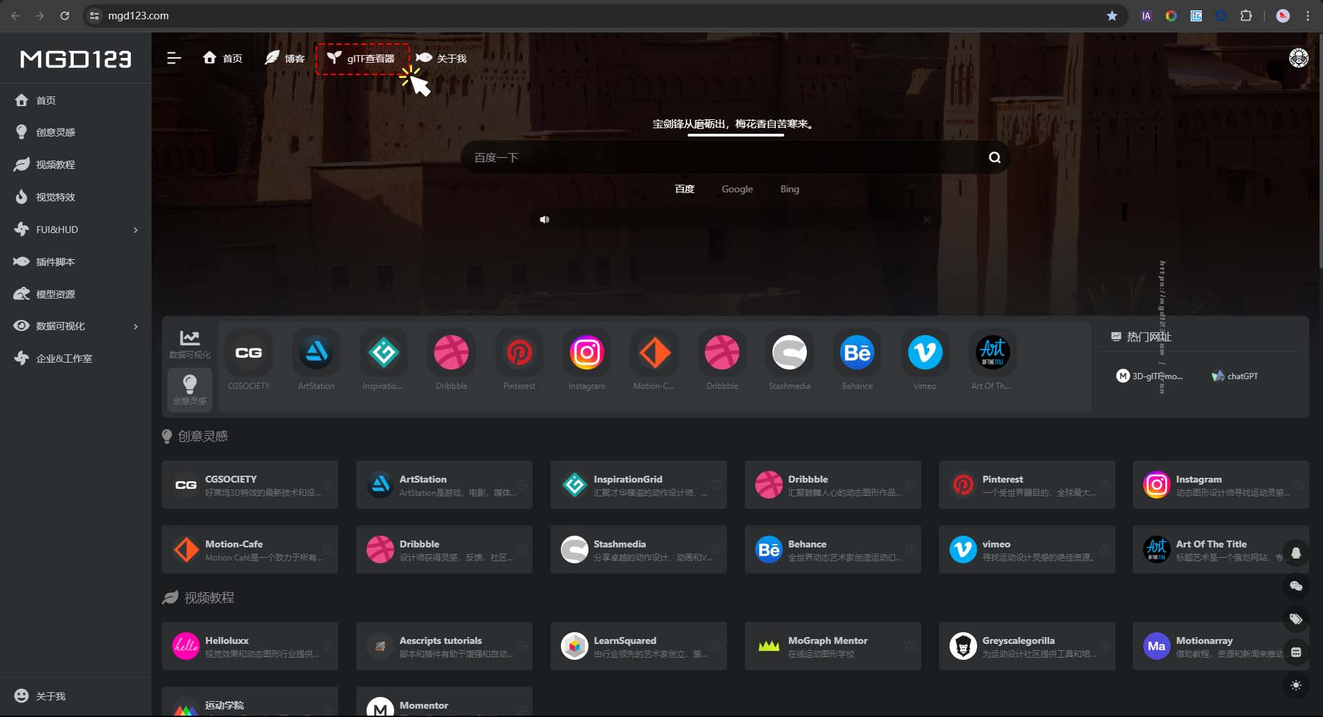 打开浏览器Chrome(建议),输入网址mgd123.com,点击下图所示按钮器跳转到glTF查看器: