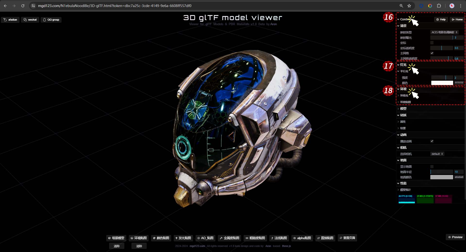 - 光源的魔法:在三维世界中,光源如同魔法师手中的魔杖,能够赋予模型以生命。glTF查看器允许你轻松调整环境光和平行光的强度,环境光和平行光的范围是标准的物理范围,支持设置环境贴图,背景以及模糊等,让模型在光影的交织中展现出丰富的层次感。